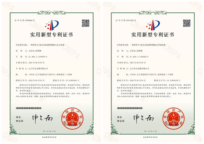 2022年3月1日,公司申報《一種新型B1級無鹵低煙阻燃耐火控製電纜》《一種新型B1級無鹵低煙阻燃耐火左手APP下载免费下载》實用新型zhuanli獲得國家知識產權局授權,並取得實用新型zhuanli證書。